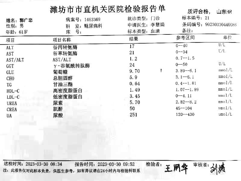 2023 年 6 月因糖尿病入院治疗,出院时葡萄糖值 12.1mmol/L ,经仪器干预两个月后血糖恢复正常,2024 年 8 月底体检葡萄糖值 5.72mmol/L ,身体已完全康复 。